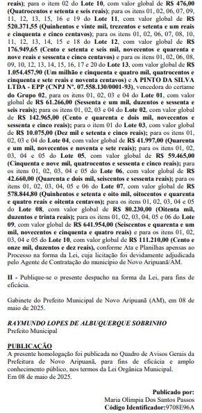 A. PINTO DA SILVA LTDA vai ganhar R$ 1.770.668,80 (um milhão, setecentos e setenta mil, seiscentos e sessenta e oito reais e oitenta centavos), da Prefeitura de Novo Aripuanã.