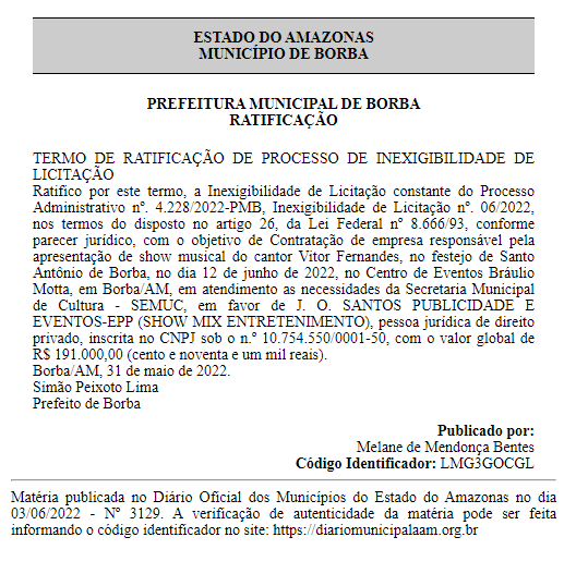 O prefeito de Borba, Simão Peixoto (PP), vai gastar quase R$ 400 mil com a contratação dos cantores Tarcísio do Acordeom e do cantor Vitor Fernandes para os festejos de Santo Antônio de Borba, com apresentações a serem feitas no dia 12 de junho de 2022.