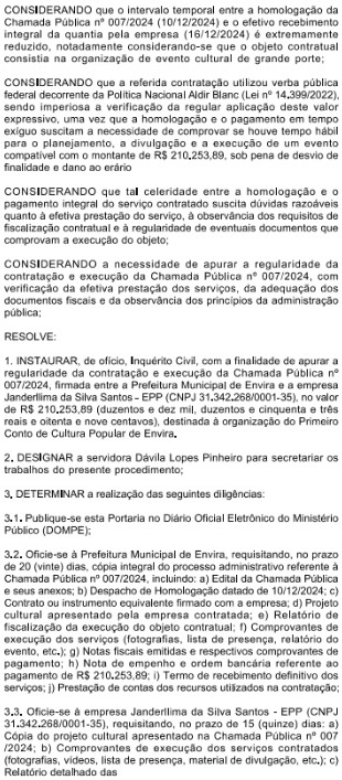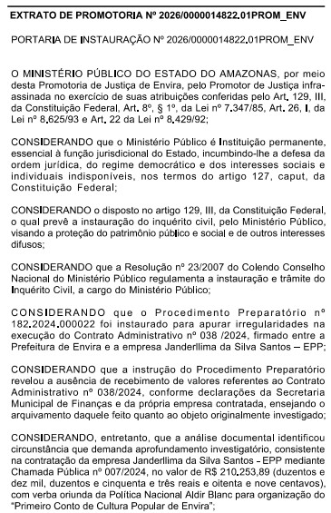 A investigação é por conta da contratação da empresa JANDERLLIMA DA SILVA SANTOS – EPP, para o “Primeiro Conto de Cultura Popular de Envira”, homologada em uma chamada pública da Política Nacional Aldir Blanc.
