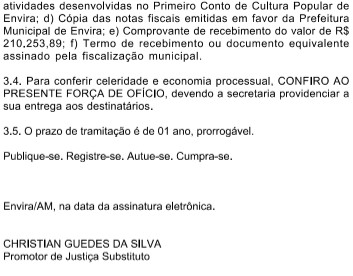 O MP-AM deu o prazo de 15 dias para que a gestão pública apresente os documentos do processo administrativo na íntegra, juntamente com o edital, contrato, projeto cultural, relatórios de fiscalização, comprovantes da realização do evento, notas fiscais, ordens bancárias e prestação de contas.