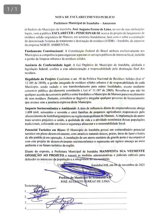 A Prefeitura Municipal dede Iranduba divulgou nesta terça-feira (04/10), uma nota pública em que se posiciona contra o projeto de instalação de um aterro sanitário destinado ao recebimento de resíduos sólidos. O empreendimento seria de responsabilidade da empresa Norte Ambiental, sob o nome de Sistema de Tratamento e Destinação de Resíduos (STDR).
