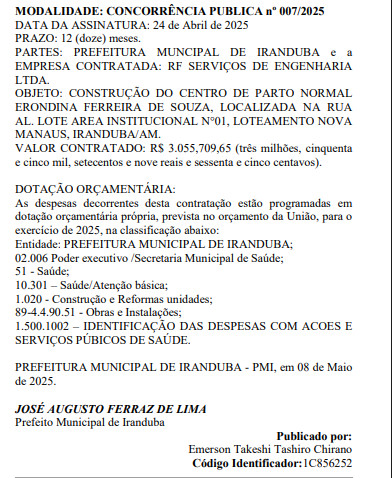 O que chama atenção nesta contratação que além de ser um alto investimento para uma cidade carente como Iranduba, é que a empresa R.F. SERVIÇOS DE ENGENHARIA LTDA, foi criada em 2022 e já vem recebendo contratos com a Prefeitura de Iranduba, mesmo não tendo sede no Amazonas.