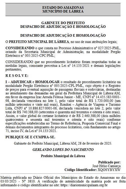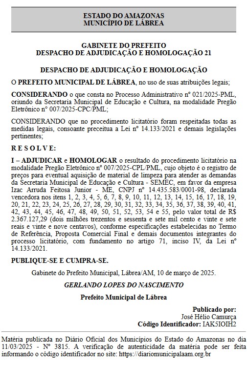 O que chama atenção é que a empresa IZAC ARRUDA FEITOSA JUNIOR – ME, já possuí outros contratos firmados com a Prefeitura de Lábrea, na gestão de Gerlando Lopes, como a aquisição de material de limpeza para a Secretaria Municipal de Educação e Cultura (Semec), no valor de R$ 2.367.127.29 (dois milhões trezentos e sessenta e sete mil cento e vinte e sete reais e vinte e nove centavos).