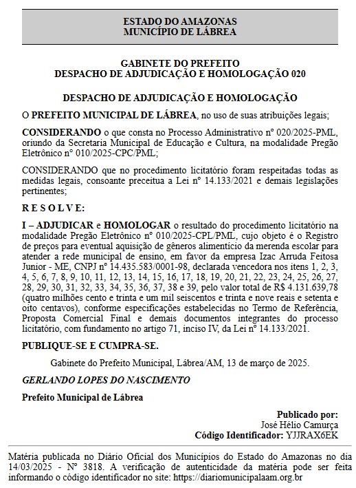Outro grande contrato entre a Prefeitura de Lábrea com a empresa IZAC ARRUDA FEITOSA JUNIOR – ME, para a aquisição de gêneros alimentícios para merenda escolar da rede municipal de ensino, no valor total de R$ 4.131.639,78 (quatro milhões cento e trinta e um mil seiscentos e trinta e nove reais e setenta e oito centavos).