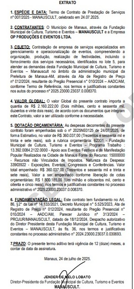 O Diário Oficial de Manaus desta última segunda-feira (28), mostra que a empresa O.P. PRODUÇÕES E EVENTOS LTDA foi contratado por R$ 2.160.222,00 (dois milhões, cento e sessenta mil, duzentos e vinte e dois reais), para “serviços especializados em gerenciamento e operacionalização de eventos, compreendendo a organização, produção, realização de festividades, incluindo fornecimento dos serviços necessários”.