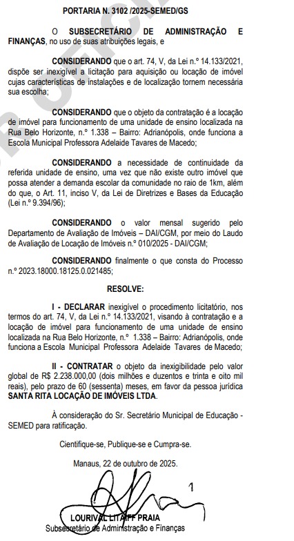 De acordo com informações do Diário Oficial do Município, a Prefeitura de Manaus por meio da Secretaria Municipal de Educação (Semed), renovou o contrato com a empresa SANTA RICA LOCAÇÃO DE IMÓVEIS LTDA, pelo valor total de R$ 2.238.000,00 (dois milhões, duzentos e trinta e oito mil reais).