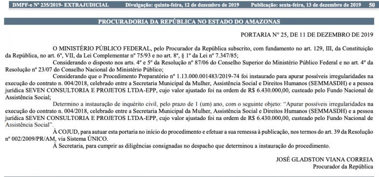 A Prefeitura de Manaus por meio da Secretaria Municipal de Saúde (Semsa), renovou um contrato milionário com uma empresa investigada pelo Ministério Público Federal (MPF), por irregularidades em um contrato entre a empresa SEVEN CONSULTORIA E PROJETOS LTDA e Secretaria Municipal da Mulher, Assistência Social e Direitos Humanos (Semmasdh).
