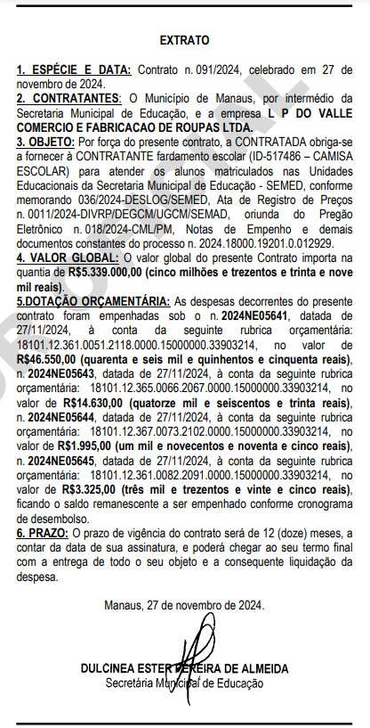 Além de ser estranho um contrato ter sido firmado ainda em novembro de 2024, e divulgado apenas agora, o que chama atenção é que no contrato não traz a informação de quantas camisas serão entregues ou quais as escolas e/ou creches que serão atendidas.