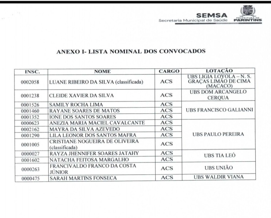 A lista com os nomes dos convocados, cargos e locais de lotação está disponível no anexo do edital, contemplando vagas para Agente Comunitário de Saúde em diferentes unidades do município.