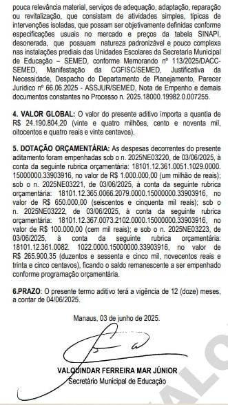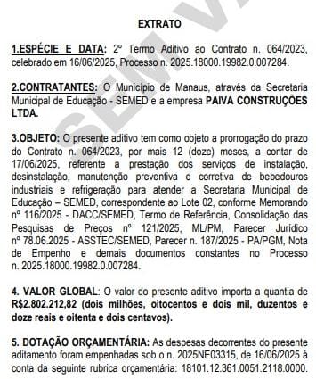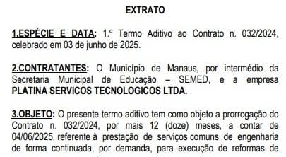 De acordo com o Diário Oficial do Município (DOM) desta última segunda-feira (7), o prefeito David Almeida (Avante) e o secretário Valquindar Ferreira Mar Júnior, o “Júniormar”, vão pagar para a empresa PLATINA SERVIÇOS TECNOLÓGICOS LTDA, o valor de R$ 24.190.804,20 (vinte e quatro milhões, cento e noventa mil, oitocentos e quatro reais e vinte centavos), na renovação do contrato.