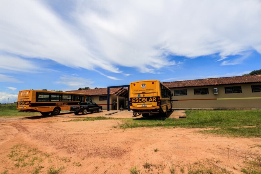 Unidade passa por reparos em salas de aula e espaços administrativos, enquanto ônibus escolares que atendem estudantes da comunidade também passam por manutenção