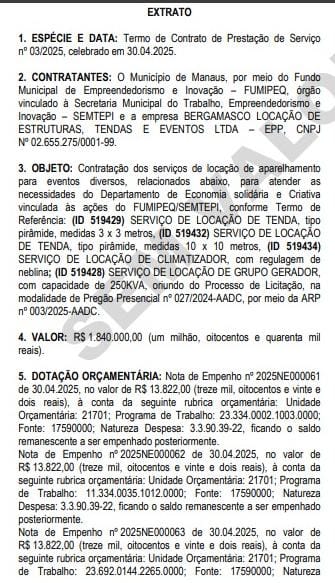 Outro contrato assinado será com a empresa BERGAMASCO LOCAÇÃO DE ESTRUTURAS, TENDAS E EVENTOS LTDA, que ganhará de David Almeida (Avante), R$ 1.840.000,00 (um milhão, oitocentos e quarenta mil reais), para o aluguel de tendas tipo pirâmide, climatizadores com regulagem de neblina e de geradores com capacidade de 250 KVA, pagos com recursos do Fundo Municipal de Empreendedorismo e Inovação (Fumipeq).