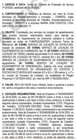De acordo com informações do Diário Oficial do Município (DOM), a empresa BARRA SOM EVENTOS LTDA, vai receber R$ 9.144.158,95 (nove milhões, cento e quarenta e quatro mil, cento e cinquenta e oito reais e noventa e cinco centavos), para prestar serviços de locação de estrutura, equipamento de iluminação, tendas, palcos, equipamentos de sonorização e organização de eventos.