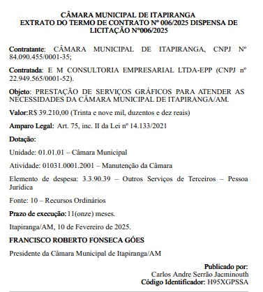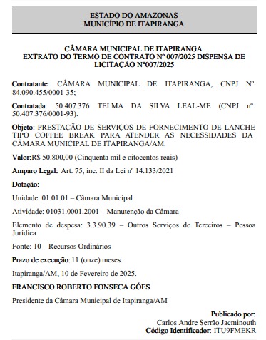 O presidente da Câmara Municipal de Itapiranga, Francisco Roberto Fonseca Góes, mais conhecido como “Dr. Góes” (Republicanos), dispensou licitação para a contratação de uma empresa pra fornecer café da manhã e outra para serviços gráficos para a casa legislativa municipal.