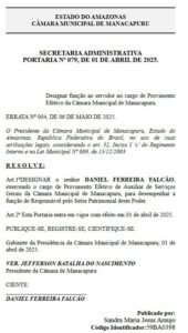Manacapuru (AM) – Em meio a denúncias sobre pagamentos irregulares e suspeitas de “super salários” na Câmara Municipal de Manacapuru, uma nova medida administrativa chamou atenção e gerou polêmica. O presidente da Casa, vereador Jefferson Batalha do Nascimento, assinou uma portaria que designa um auxiliar de serviços gerais para atuar como responsável pelo Setor Patrimonial do Legislativo.