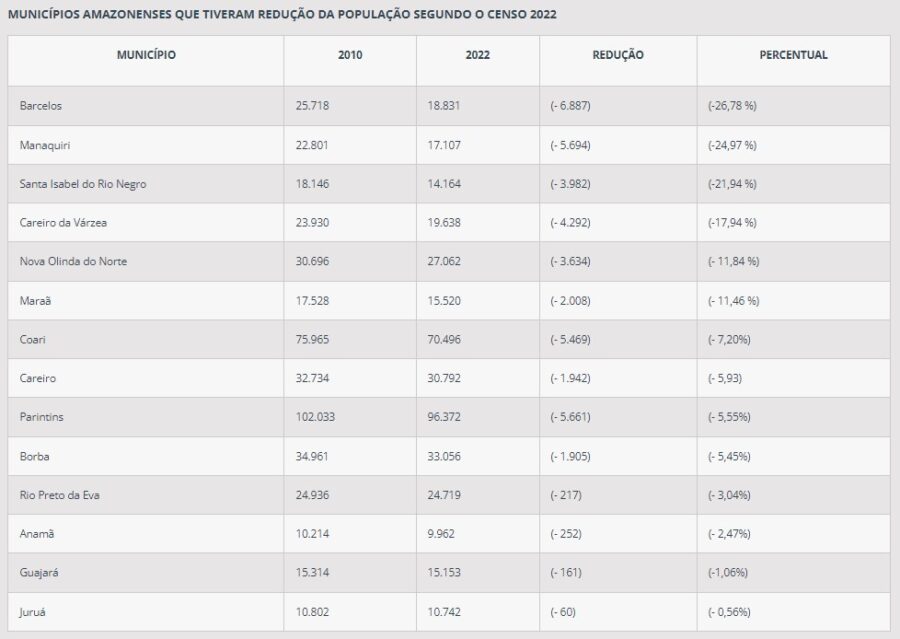 Como exemplos, o deputado elencou os municípios amazonenses que mais perderam habitantes conforme o Censo: Barcelos, que perdeu 6.887 habitantes; Manaquiri, 5.694, e Santa Isabel do Rio Negro, 3.982 (tabela em anexo). “Precisamos ficar atentos às consequências que isso pode trazer para as nossas cidades. Aqui no Amazonas, 14 municípios estão nessa situação, sendo que Barcelos foi a que mais perdeu. Uma redução de 26,78% de sua população, o que significa, em números absolutos, 6.887 habitantes a menos quando comparado ao último Censo, em 2010. Segundo a CNM (Confederação Nacional dos Municípios), entre os estados brasileiros, Amazonas e Rondônia são os que perderam maiores coeficientes, com 61% dos municípios afetados”, alertou.