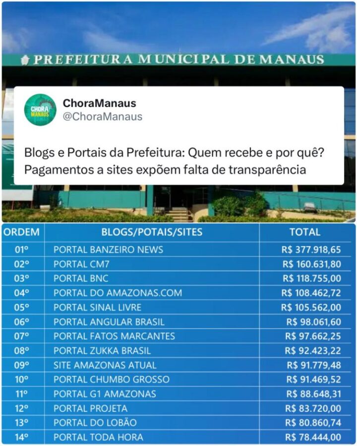 Pagamentos de verba pública direcionados a um pequeno site de Manaus por parte da prefeitura comandada por David Almeida (Avante), estão dando o que falar na cidade. O Portal Banzeiros News tornou-se o campeão de arrecadação na Secretaria Municipal de Comunicação (SEMCOM), mesmo tendo uma audiência pífia.