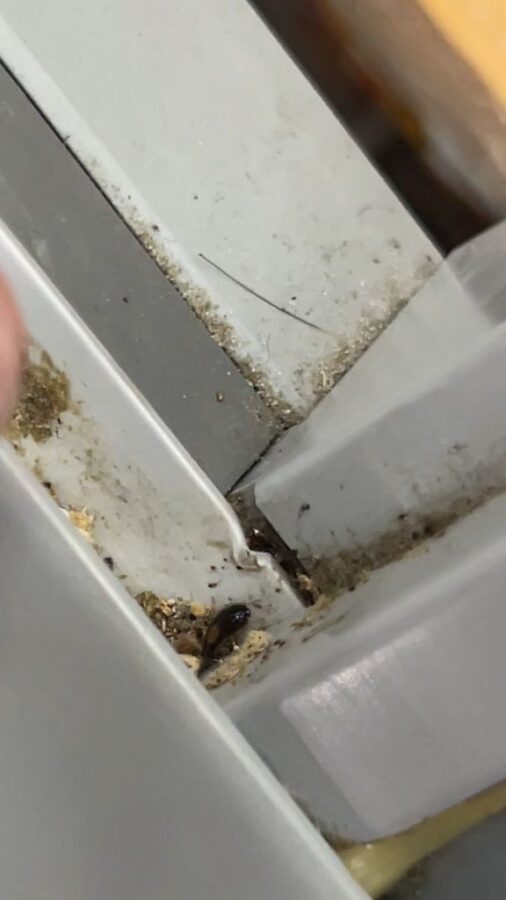 Durante a fiscalização, foram encontradas baratas e moscas circulando pelos alimentos, além de fezes de rato sobre latas de milho em conserva