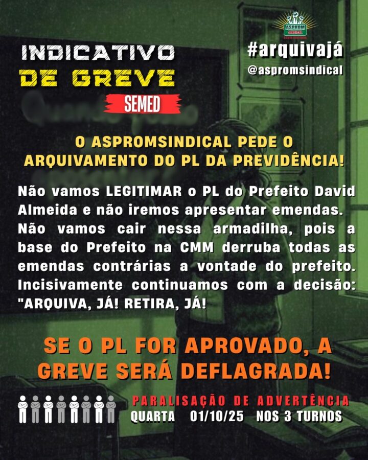 Manaus- O Sindicato dos Professores e Pedagogos de Manaus (AspromSindical) anunciou a realização da 2ª paralisação de advertência, marcada para o próximo dia 1º de outubro, em todos os turnos de trabalho da rede municipal de ensino. O movimento é uma resposta ao Projeto de Lei nº 08/2025, de autoria do prefeito David Almeida (Avante), que propõe mudanças na previdência municipal (Manausprev).