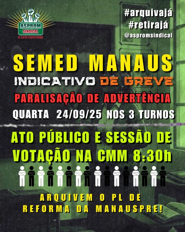 O Sindicato dos Professores e Pedagogos do Amazonas (ASPROM/Sindical), confirmou nesta quarta-feira (24/09), que fará uma paralisaçõa de advertência, em protesto ao Projeto de Emenda à Lei Orgânica do Município de Manaus, que muda as regras de aposentadoria dos servidores da Prefeitura de Manaus.