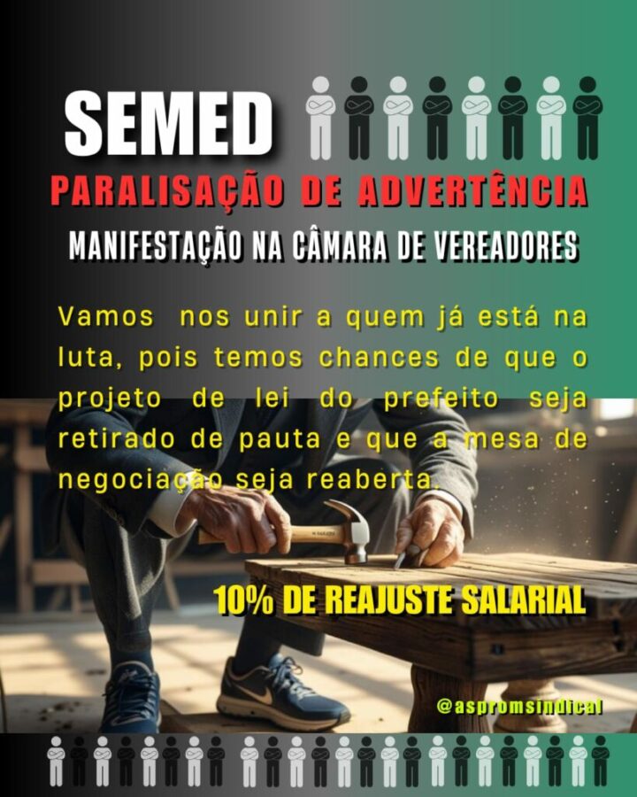 O Objetivo da categoria é pressionar os vereadores e barrar o Projeto de Lei (PL) nº 350/2025, que dá um reajuste salarial de apenas 5,48% aos servidores da educação. A categoria defende que o reajuste tem de ser de 10% para toda a rede municipal.