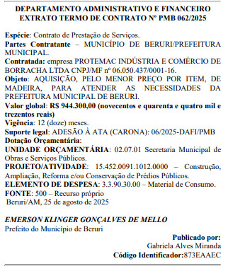 De acordo com o Diário Oficial dos Municípios (DOM) desta segunda-feira (26/08), o prefeito Klinger Mello vai contratar a empresa PROTEMAC INDÚSTRIA E COMÉRCIO DE BORRACHA LTDA, pelo valor de R$ 944.300,00 (novecentos e quarenta e quatro mil e trezentos reais), para fornecer madeira para a Prefeitura de Beruri.