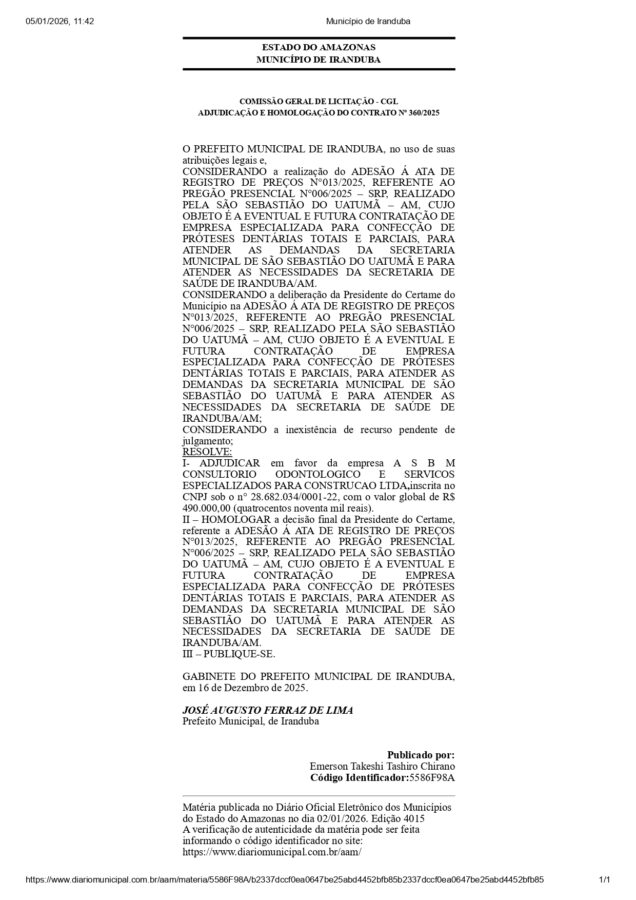 De acordo com o Diário Oficial dos Municípios (DOM), Ferraz pegou carona no contrato feito pela Prefeitura de São Sebastião do Uatumã, com a empresa A. S. B. M. CONSULTÓRIO ODONTOLÓGICO E SERVIÇOS ESPECIALIZADOS PARA CONSTRUÇÃO LTDA, para a confecção de próteses dentárias totais e parciais no valor de R$ 490 mil reais.