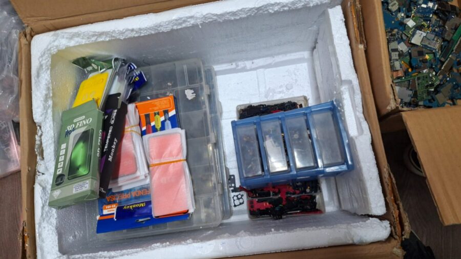 As equipes foram ao local e localizaram o suspeito denunciado. O homem foi encontrado na companhia de outro homem, que também foi detido. Na banca, os policiais encontraram diversas peças entre frontal, carcaças, câmeras, cabo flet, bateria, gaveteiro com leitor biométrico, películas, centenas de bandeja de chip e um notebook com programas de desbloqueio de celulares.