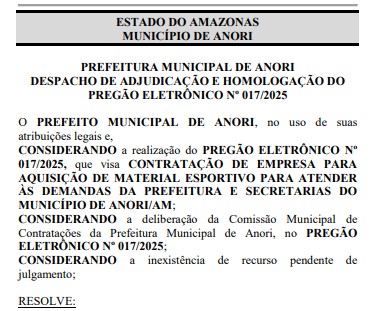 O prefeito Reginaldo Nazaré da Costa, mais conhecido como “Regis Nazaré” (Republicanos), vai gastar mais de R$ 1,4 milhão de reais na compra de material esportivo para atender as demandas da Prefeitura de Anori, no interior do Amazonas.