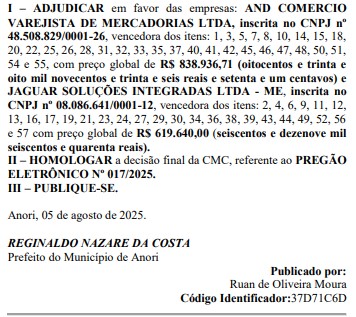 A empresa A. N. D. COMÉRCIO VAREJISTA DE MERCADORIAS LTDA, vai receber o valor de R$ 838.936,71 (oitocentos e trinta e oito mil novecentos e trinta e seis reais e setenta e um centavos). Já a empresa JAGUAR SOLUÇÕES INTEGRADAS LTDA – ME, vai receber da Prefeitura de Anori o valor de R$ 619.640,00 (seiscentos e dezenove mil seiscentos e quarenta reais).