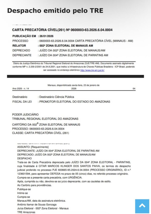O procedimento está vinculado à Ação de Investigação Judicial Eleitoral (AIJE), registrada sob o número 0600665-95.2024.6.04.0004, que tramita na Justiça Eleitoral de Parintins. A ação busca esclarecer denúncias relacionadas a possível uso indevido de estruturas públicas durante o período eleitoral.