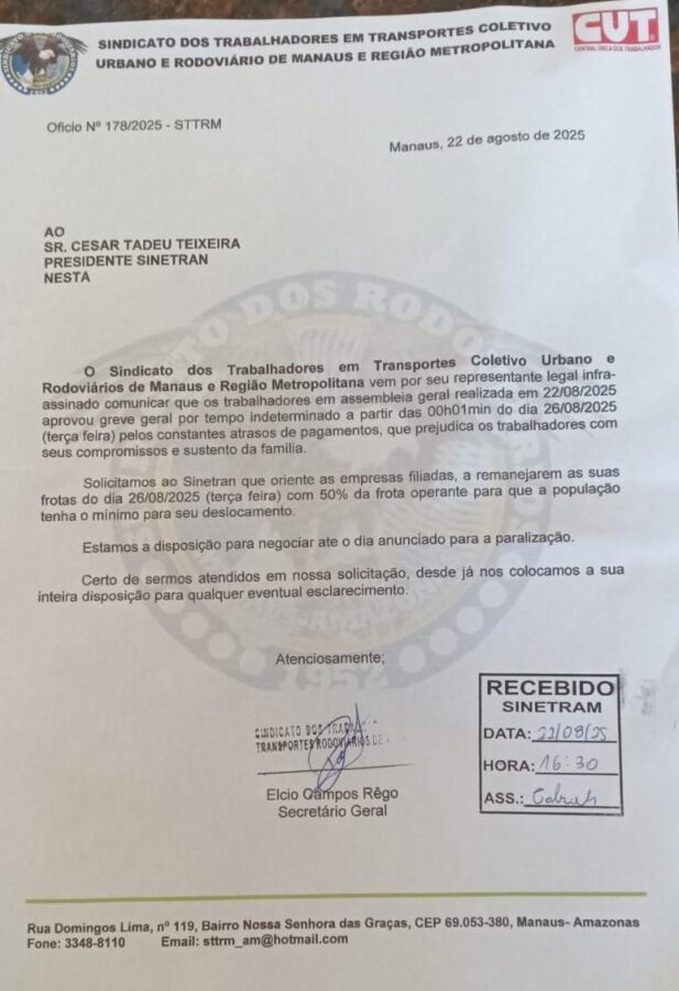 O documento oficilizado pelo Sindicado dos Trabalhadores em Transporte Coletivo Urbano e Rodoviário de Manaus e Região Metropolitana (STTRM), afirma que a greve dos trabalhadores do transporte coletivo vai iniciar as zero horas da terça-feira (26/08), e deve permanecer por tempo indeterminado.