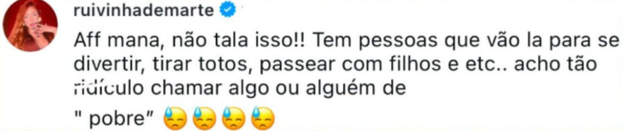 “Aff, mana, não fala isso. Tem pessoas que vão lá para se divertir, tirar fotos, passear com os filhos e etc. Acho tão ridículo chamar algo ou alguém de pobre”, escreveu Ruivinha.