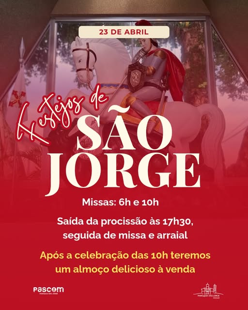 A programação da Paróquia de São Jorge para os festejos do padroeiro, terá uma procissão as 17h30, seguida de missa solene com o tradicional arraial com venda de guloseimas, para encerrar os festejos do santo.
