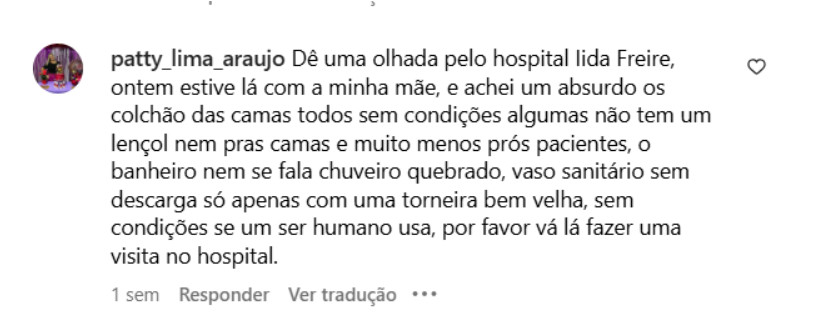 Relatos de pacientes e acompanhantes apontam para uma situação ainda mais alarmante: falta de medicamentos, lençóis, cobertores e longas esperas por atendimento. “Recebemos água quente porque o bebedouro está quebrado. Não tem lençol, nem ventilador funcionando. Parece um campo de guerra”, declarou uma paciente, que pediu anonimato.