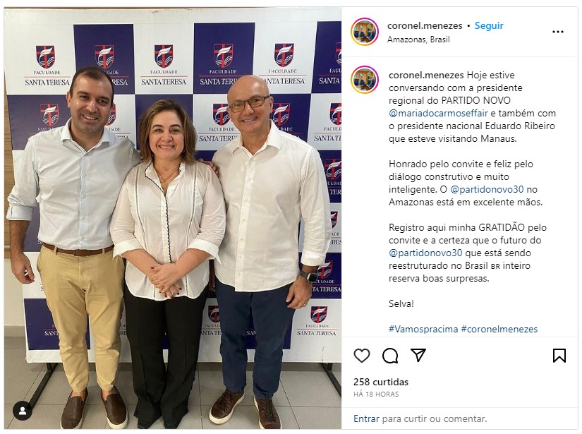 Em suas redes sociais, Menezes postou uma imagem ao lado da presidente regional do Partido Novo, Maria do Carmo Seffair, e do presidente nacional Eduardo Ribeiro em uma visita a cidade de Manaus para tentar alavancar novos filiados ao partido na capital amazonense.