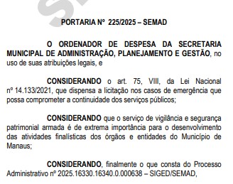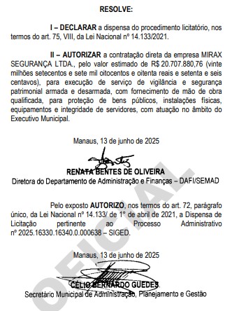 De acordo com o Diário Oficial do Município (DOM), o prefeito David Almeida (Avante), vai pagar sem licitação, a empresa MIRAX SEGURANÇA LTDA, o valor total de R$ 20.707.880,76 (vinte milhões, setecentos e sete mil, oitocentos e oitenta reais e setenta e seis centavos), pelos serviços de vigilância e segurança patrimonial armada e desarmada.