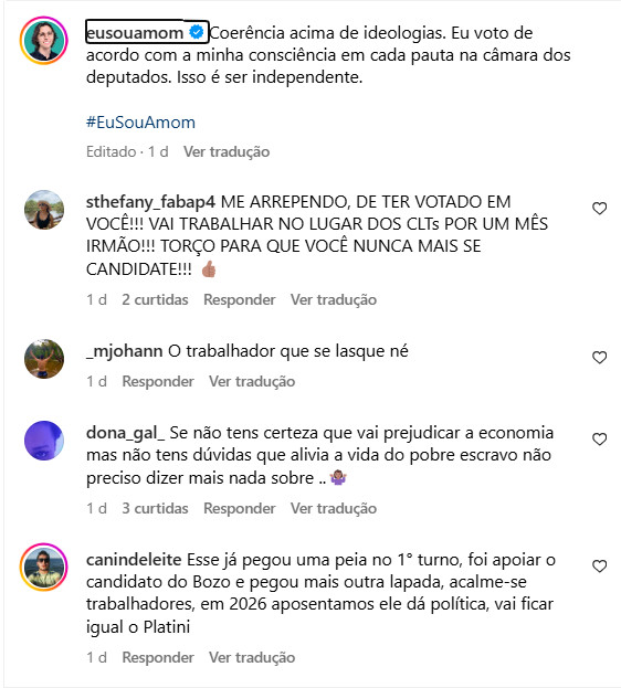 “Amom, você já foi CLT? Já pegou um ônibus 6x por semana, para ir e para voltar?”, disse outro seguidor.