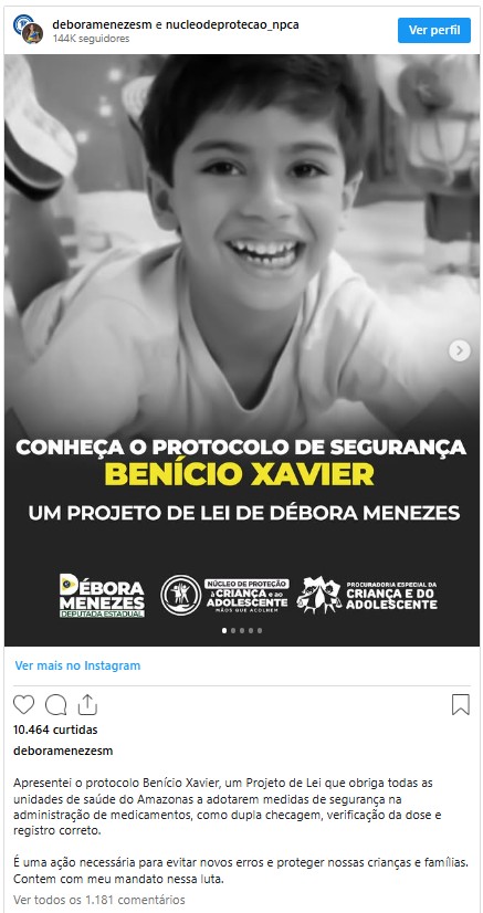 A parlamentar usou sua conta do Instragram para anunciar que apresentou um Pojeto que cria um protocolo de segurança hospitalar com o nome do menino que foi vítima de erro médico, mas esqueceu que esse protocolo já existe.
