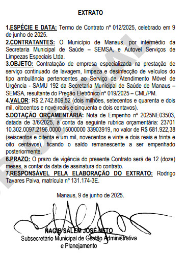 De acordo com publicação do Diário Oficial de Manaus (DOM) desta segunda-feira (21), a empresa AUTOVEL SERVIÇOS DE LIMPEZAS ESPECIALIZADAS LTDA, vai receber dos cofres públicos o total de R$ 2.742.809,52 (dois milhões, setecentos e quarenta e dois mil, oitocentos e nove reais e cinquenta e dois centavos), para lavar as ambulâncias do Samu.