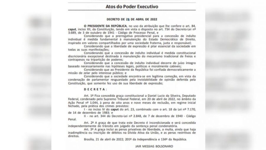 O presidente Jair Bolsonaro (PL) anunciou, nesta quinta-feira (21), que assinou um decreto de “graça constitucional” ao deputado federal Daniel Silveira (PTB-RJ). “Um decreto que vai ser cumprido”, disse Bolsonaro, em uma transmissão ao vivo nas redes sociais.