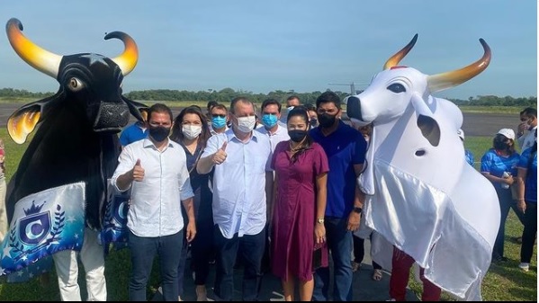 Nas redes sociais, Omar Aziz compartilhou um registro da visita à Ilha da Magia, como é conhecida a cidade. Ao lado do senador, posam para a foto os bois-bumbás Caprichoso e Garantido, símbolos da cultura parintinense.