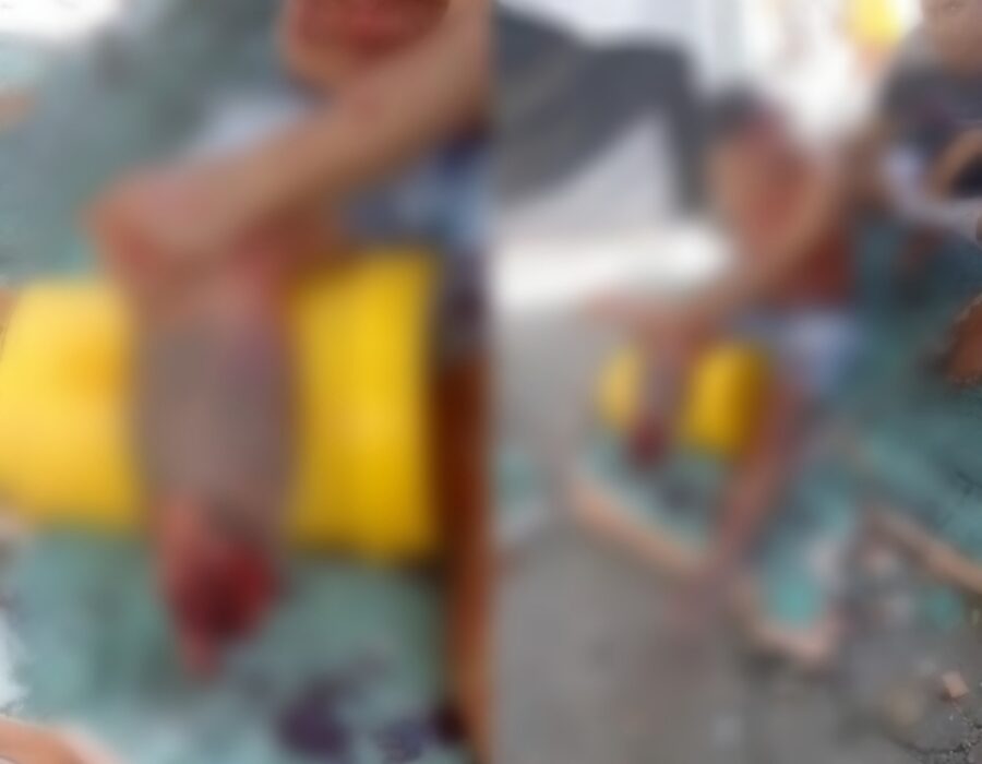 Nas imagens, é possível ver o homem sentado sem o membro enquanto aguarda socorro médico.