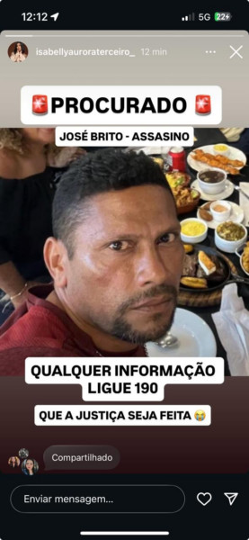 Na publicação, que rapidamente viralizou, a foto do suspeito aparece com os dizeres: “PROCURADO – JOSÉ BRITO – ASSASSINO”. A imagem inclui um apelo para que qualquer informação sobre o paradeiro do homem seja repassada à polícia pelo número 190. A legenda ainda traz a frase “QUE A JUSTIÇA SEJA FEITA”, seguida por um emoji de choro.