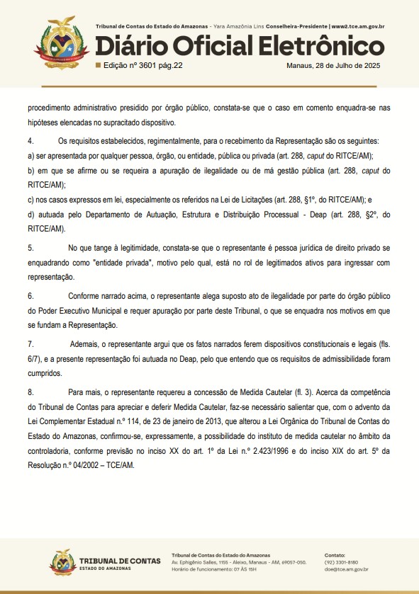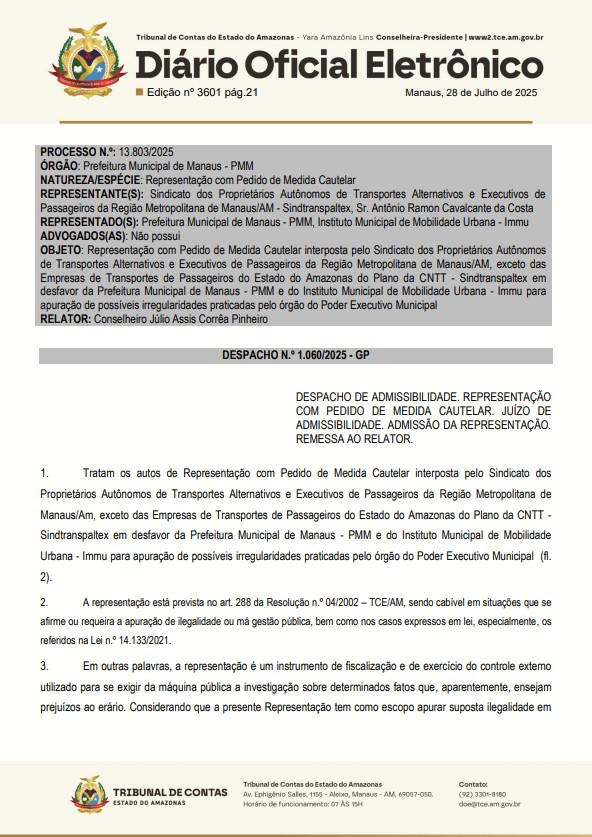 O Tribunal de Contas do Estado do Amazonas (TCE-AM), acatou um pedido de representação com medida cautelar do Sindicato dos Proprietários Autônomos de Transportes Alternativos e Executivos de Passageiros da Região Metropolitana de Manaus – AM, exceto das Empresas de Transportes de Passageiros do Estado do Amazonas do Plano da CNTT (Sindtranspaltex), contra a Prefeitura de Manaus, por conta irregularidades cometidas pelo prefeito David Almeida (Avante).