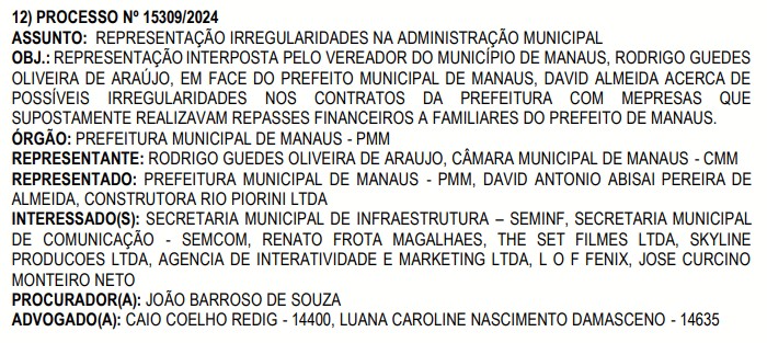 O Tribunal de Contas do Estado do Amazonas (TCE-AM), deve julgar nesta quinta-feira (16/10), a representação com pedido de medida cautelar contra o prefeito David Almeida (Avante), por conta de irregularidades no repasse financeiro para seus familiares por meio da Secretaria Municipal de Comunicação (Semcom) e da Secretaria Municipal de Infraestrutura (Seminf).