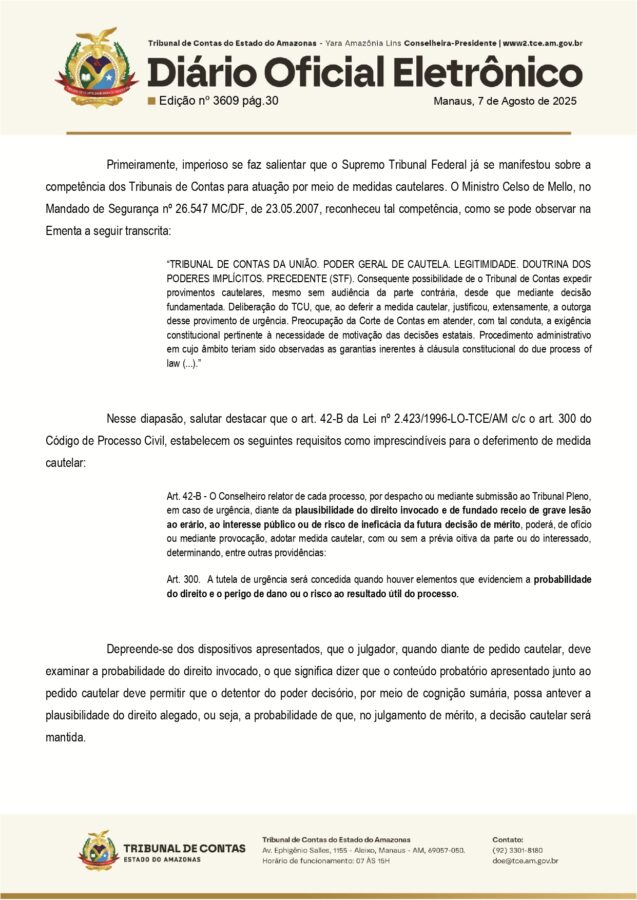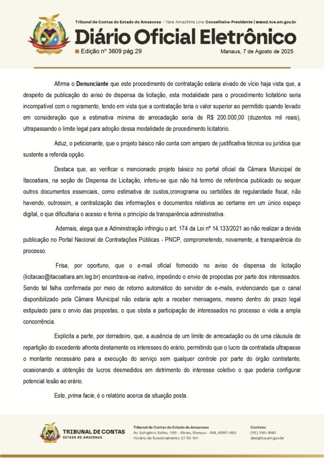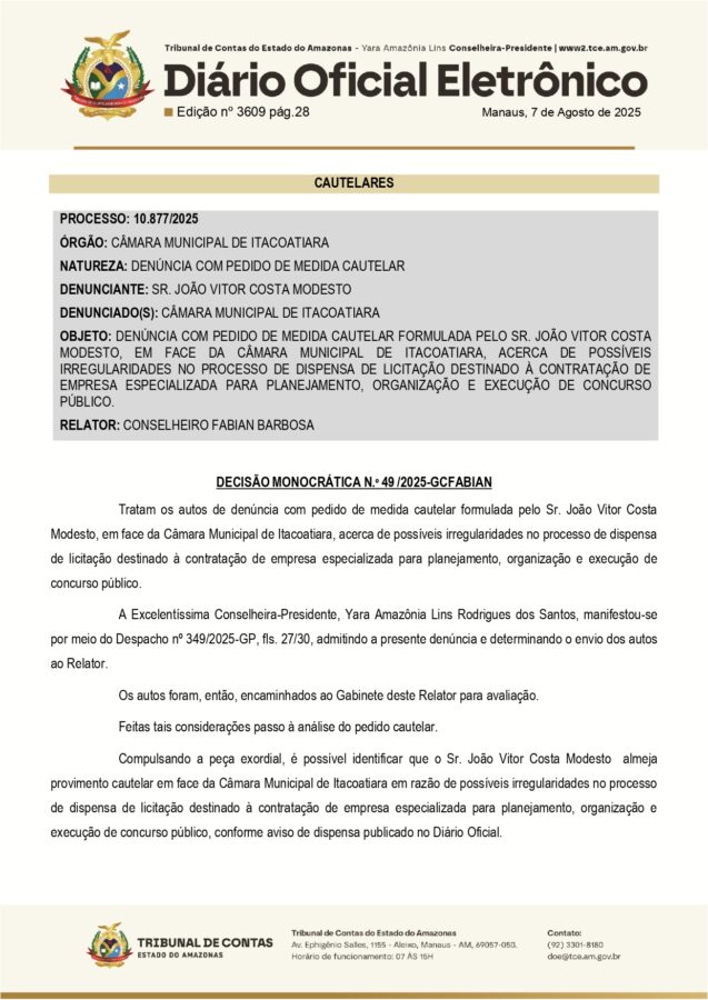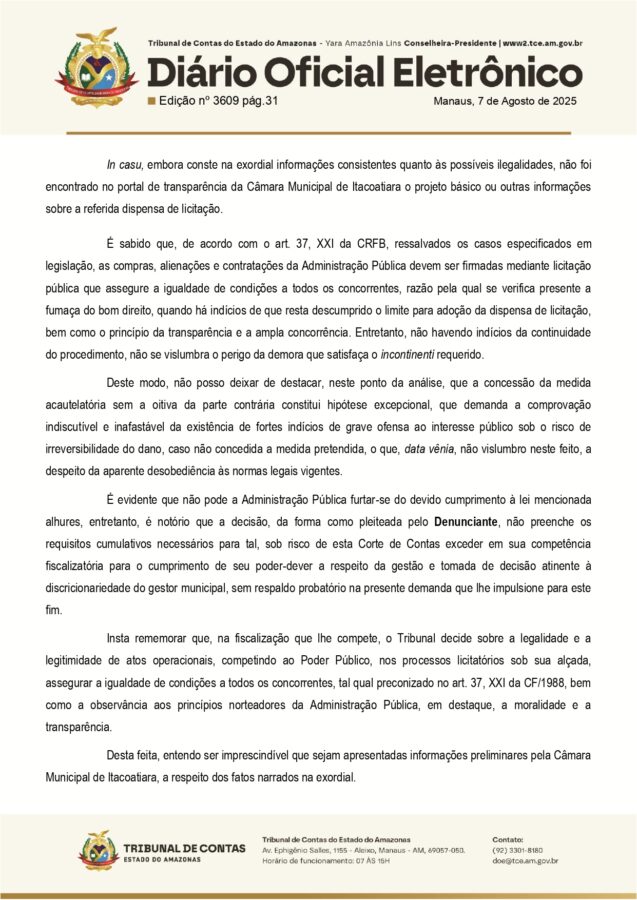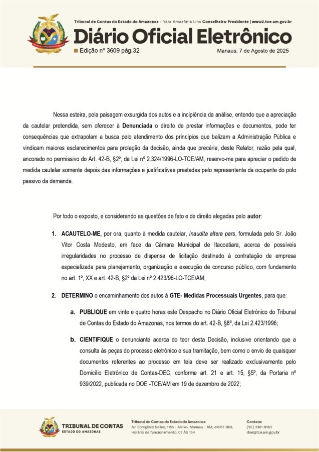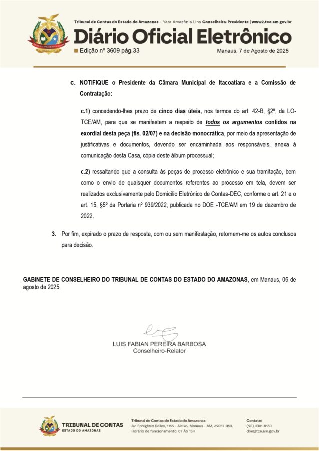 Com isso, a presidência da Câmara Municipal de Itacoatiara e sua Comissão de Contratação foram notificadas e devem apresentar defesa com documentos comprobatórios no prazo de cinco dias úteis. Após a resposta ou o fim do prazo, o processo será devolvido ao gabinete do relator para nova deliberação.