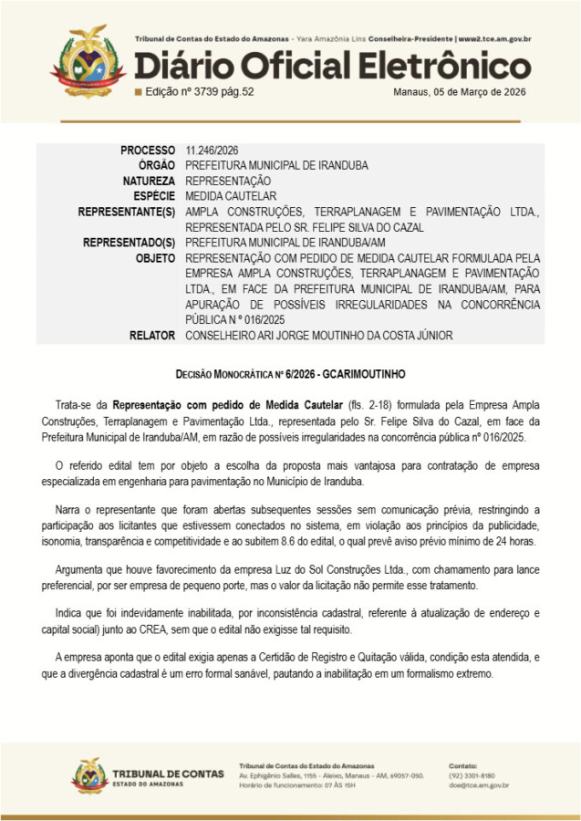 De acordo com denúncia enviada ao Tribunal de Contas do Estado do Amazonas (TCE-AM), foram apontadas  possíveis irregularidades na Concorrência Pública nº 016/2025, destinada à contratação de empresa especializada em engenharia para serviços de pavimentação no município.