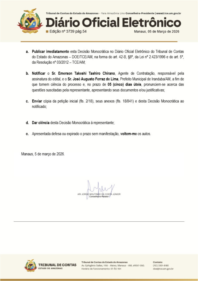 O conselheiro do TCE-AM determinou que o prefeito de Iranduba e o agente de contratação responsável pelo edital, Emerson Takeshi Tashiro Chirano, sejam notificados para apresentar justificativas e documentos no prazo de cinco dias úteis.