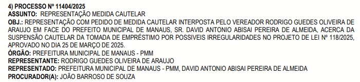 Ainda em abril desse ano, o Tribunal de Contas do Estado do Amazonas (TCE-AM), pediu do prefeito David Almeida (Avante), “esclarecimentos técnicos e jurídicos detalhados” sobre a execução do empréstimo de R$ 2,5 bilhões, aprovados na Câmara Municipal de Manaus (CMM), o que acabou não ocorrendo.